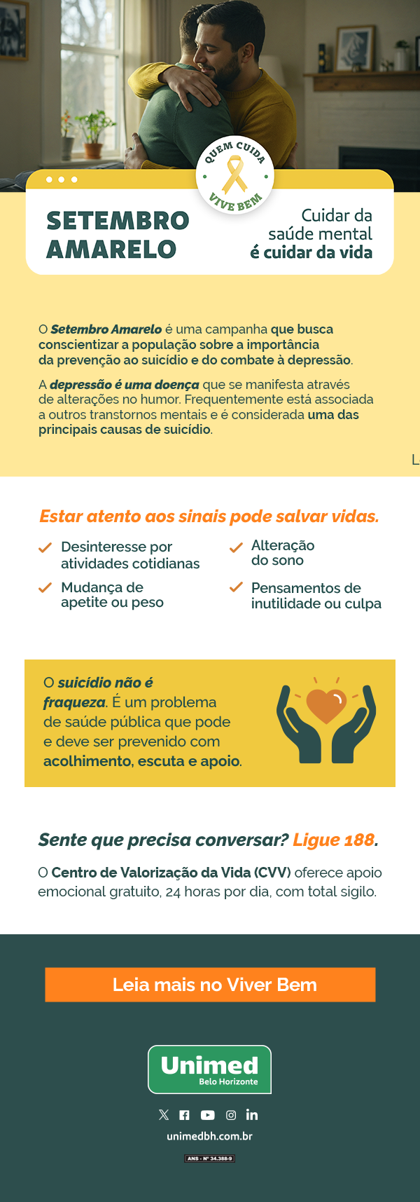 Para maiores informações sobre a campanha e a importância da prevenção, convidamos a todos a visitar o Blog Viver Bem da Unimed-BH, através do link: Setembro amarelo: a importância da prevenção ao suicídio